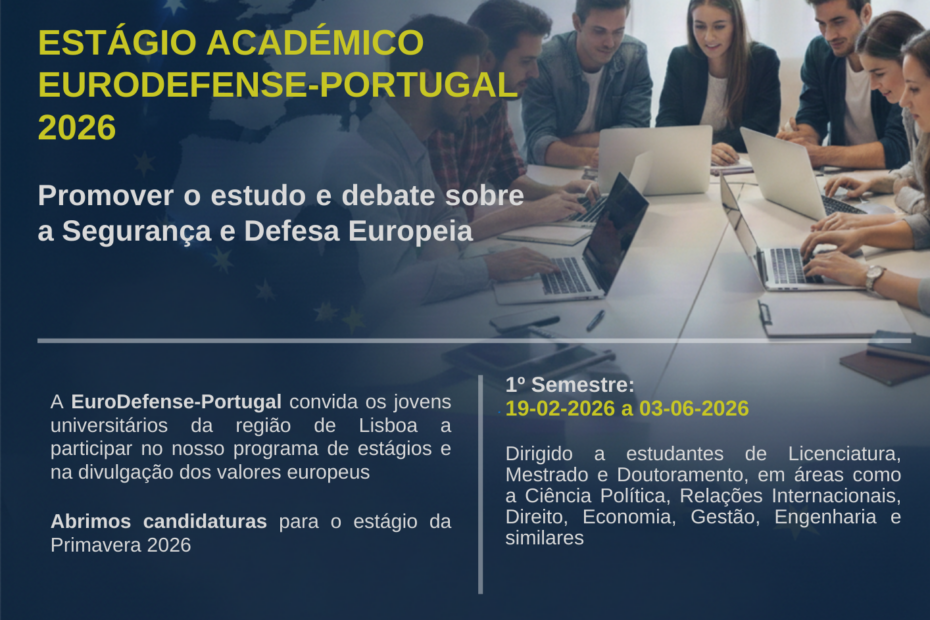 Abertura de candidaturas para o estágio da Primavera 2026 até 10 de fevereiro A EuroDefense-Portugal convida os jovens universitários da região de Lisboa a participar no nosso programa de estágios e na divulgação dos valores… Estágio Académico EuroDefense-Portugal – Primavera 2026